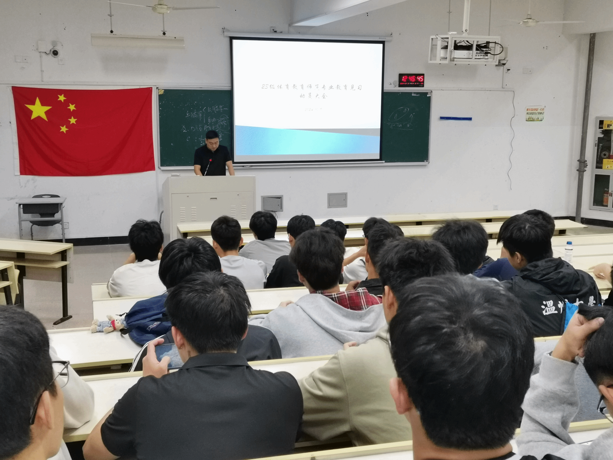 为进一步明确体育教育(师范)专业学生体育教学特点和任务,加强学生技能水平与教学实践能力,学院体育教育系于 10月9日下午在北2-101召开了23级体育教育(师范)专业《教育见习二》动员大会。院体育教育系副主任周义义,教师代表矫镇红出席本次会议,全体23级体育教育(师范)专业学生参加。