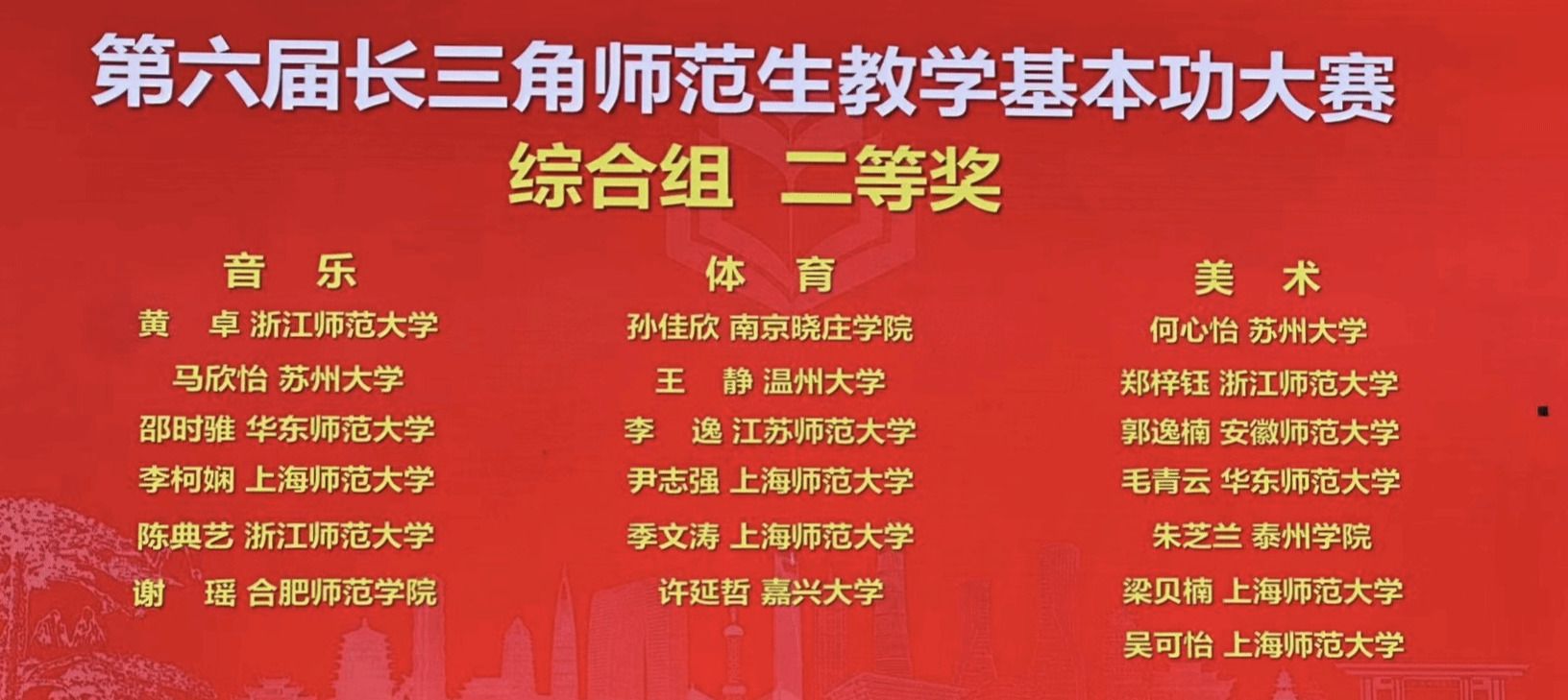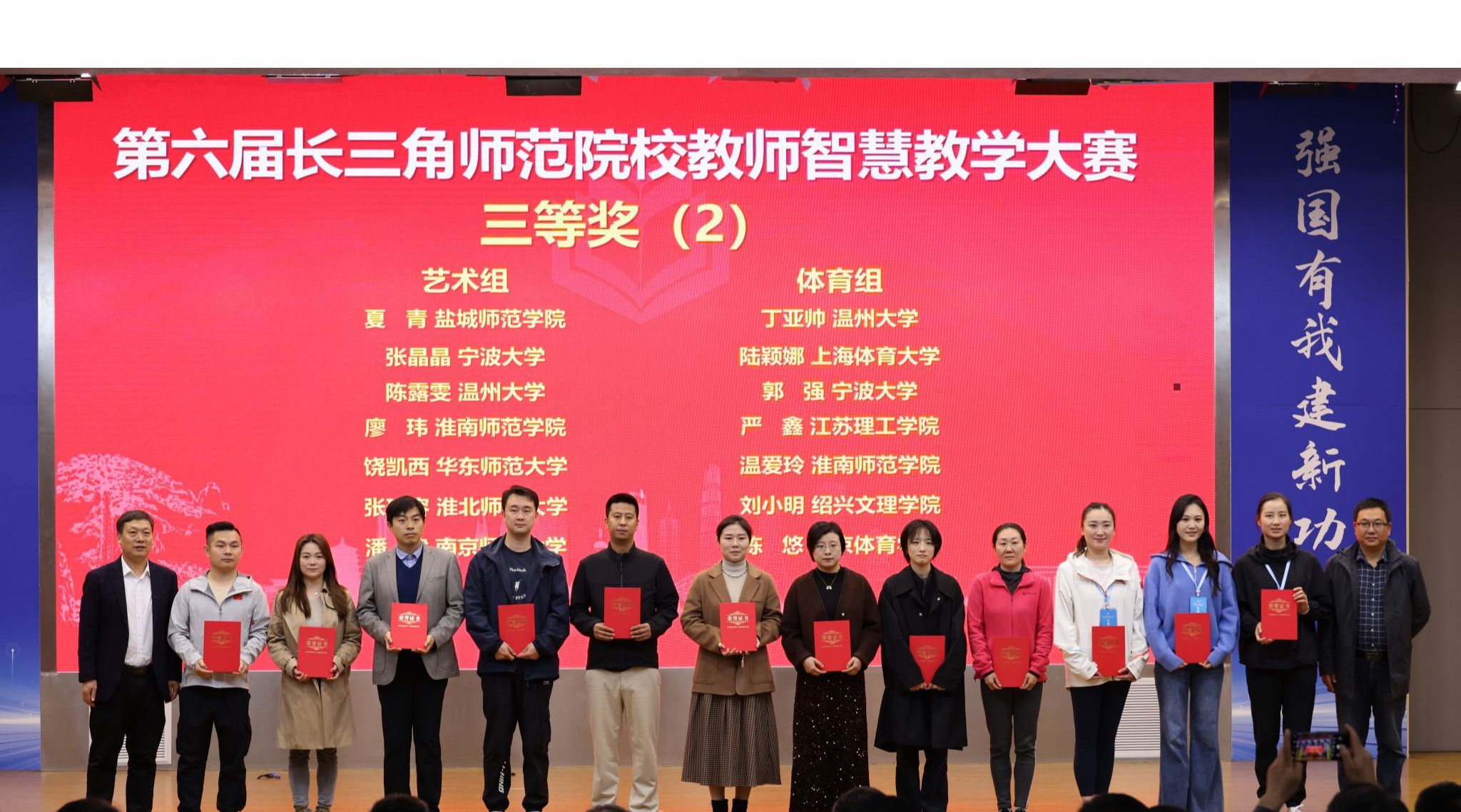 11月17日,由浙江省教育厅、安徽省教育厅、上海市教育委员会和江苏省教育厅联合举办的第六届长三角师范院校教师智慧教学大赛和师范生教学基本功大赛在安徽师范大学圆满落幕。我院教师丁亚帅荣获三等奖,21级体育教育(师范)专业王静荣获二等奖。