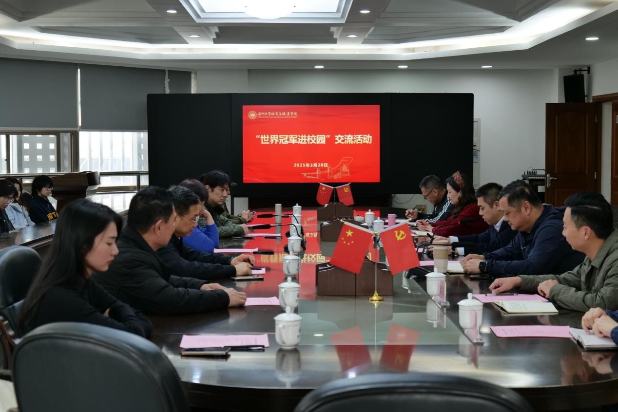 周德奎围绕学院的发展历程、师资力量、学科科研、专业设置、人才培养、招生就业、服务地方、运动赛事、党建工作等作了详细的介绍,他表示,学院的建设发展以及所取得的成绩,离不开社会各界的大力支持。他指出,此次世界冠军进校园活动,对激励学生成长、传播体育文化、促进体教融合、弘扬体育精神、助力学校体育发展、树立学生职业榜样等方面具有重要意义。