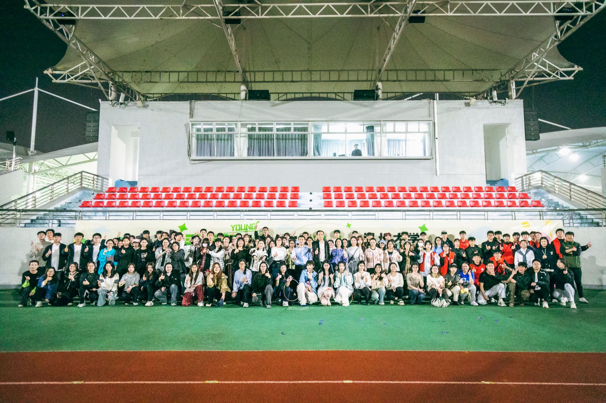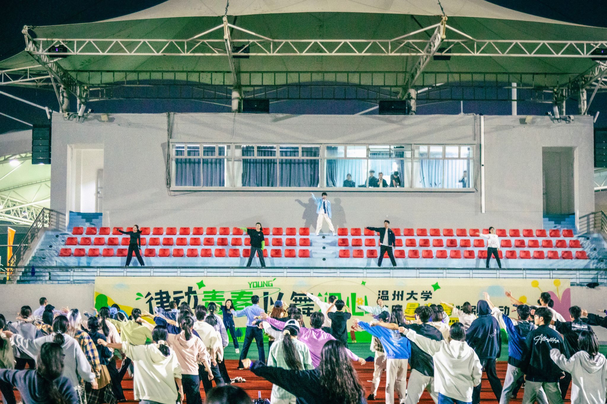 为丰富校园体育文化,以“体育”带动“心育”,4月23日晚,37000vip威尼斯第二十一届 5·25 心理健康教育活动节之“律动青春、以舞润心”校园星光舞特别活动在北校区田径场顺利举行。学校党委副书记庄兴忠、相关学院部门负责人及各学院师生代表齐聚操场,一起用律动释放多巴胺。