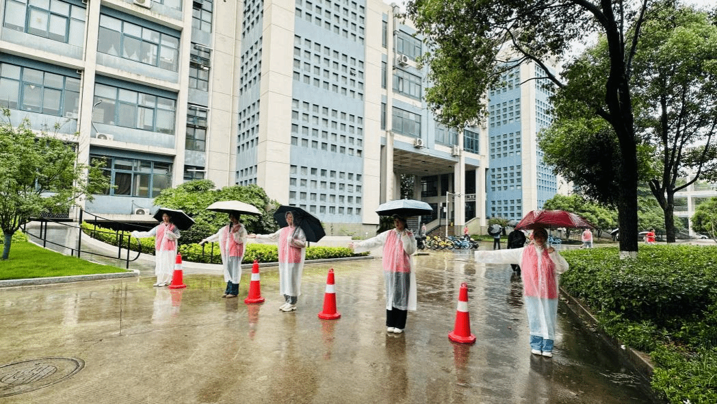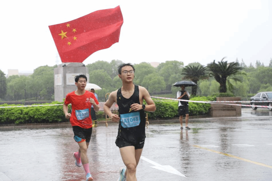 在赛道上,一抹整齐划一的身影格外醒目——国旗护卫队的队员们步伐统一、口号铿锵,“一、二、一”的节奏声穿透雨幕,与踏过积水的脚步声共振,为赛道注入一股磅礴的秩序感。他们的身影与赛道旁的校史建筑交叠,92年的办学精神与此刻的铿锵步履遥相呼应,既在书卷中沉淀,亦在脚步中生生不息。