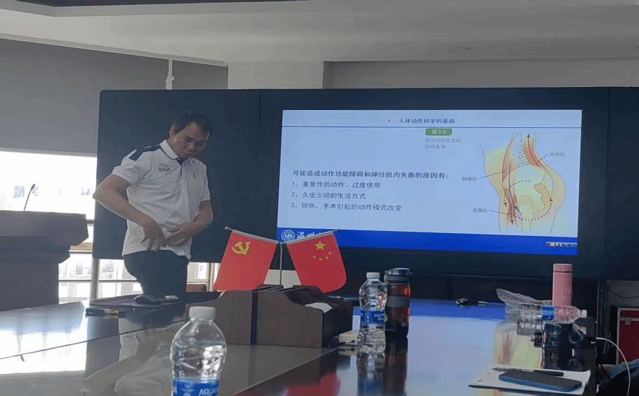 本次活动由我院邱龙潜教授主讲,他从现代学生群体的身体形态、跑步姿势等角度切入,展开了本次活动的主题讨论。邱教授指出,长时间的久坐会导致髂腰肌、胸肌等维持姿势的核心肌群发生适应性改变——这将导致主动肌屈髋肌(髂腰肌)缩短并变得紧张,进而抑制拮抗肌伸髋肌(臀大肌)的功能。屈髋肌的问题仅是久坐带来的众多问题之一,大腿后侧的腘绳肌群也会因久坐而逐渐缩短和紧张。因此,在做准备活动时,应依据肌肉的适应能力和紧张状况进行适当准备,这将有助于有效提升运动效能,并可降低运动损伤的发生概率。