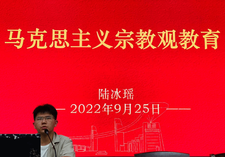 2022年9月25日,体健学院学工办辅导员陆冰瑶老师在北校区信息楼报告厅带领22级新生深入学习马克思主义宗教观的核心内容及精神内涵。陆老师从宗教的本质、产生和发展、根源和消亡、社会作用以及马克思主义政党对宗教的态度五个方面,进一步为同学们解答了马克思主义宗教观的哲学基础、基本内容及马克思主义宗教观的中国化的问题。