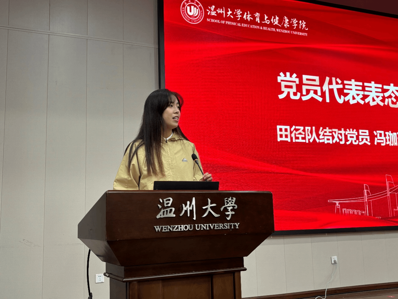 冯珈瑜作为党员代表发言,她表示作为一名党员,应积极服务群众生活,帮扶学习困难同学,在体育训练中彰显红色引领,于赛事中树立榜样,并在网络平台上发挥宣传导向与监督作用。
