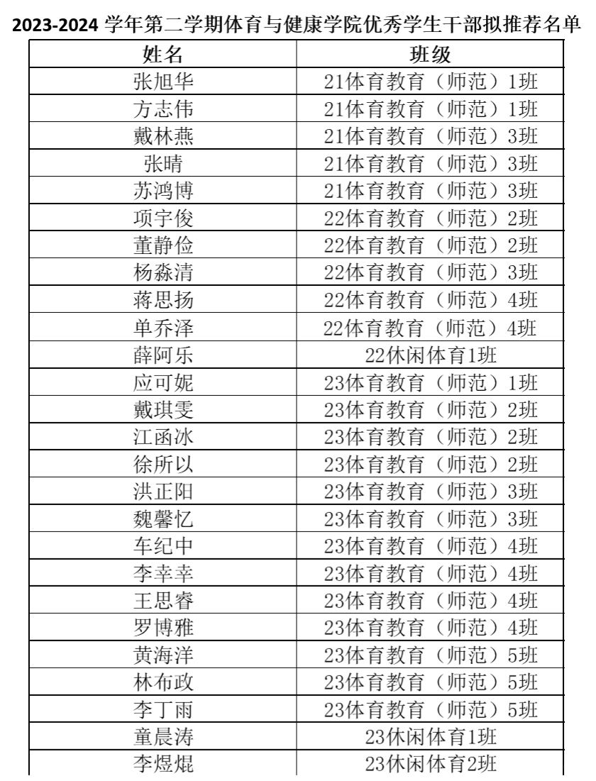 根据《关于评选2023-2024学年第二学期优秀学生干部和工作积极分子的通知》精神,坚持公开、公正、公平的原则,经过组织个人申报、资格初审、学院团委及学生代表评审、候选人汇报以及无记名投票通过:21级体育教育(师范)专业周阳等6人(名单附后)符合“2023-2024学年第二学期37000vip威尼斯优秀学生干部”拟推荐资格、21级体育教育(师范)专业张旭华等28人(名单附后)符合“2023-2024学年第二学期37000vip威尼斯优秀学生干部”拟推荐资格。22级体育教育(师范)专业张年红等18人(名单附后)符合“2023-2024学年第二学期37000vip威尼斯工作积极分子”拟推荐资格。