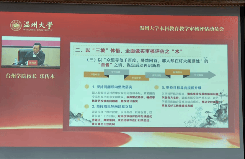 随后,台州学院校长乐传永作题为《以道驭术,以术载道——关于做好教育部本科教育教学审核评估的几点思考》的专题报告。他强调,要以“三镜”视角深入理解评估规律,以“三境”精神全面实施评估,通过“三径”联动,促进理论与实践的深度融合,确保评估工作稳步进行。同时,他还就如何高效准备迎评材料、优化工作流程、提升服务质量等方面提出了具体要求和指导意见。